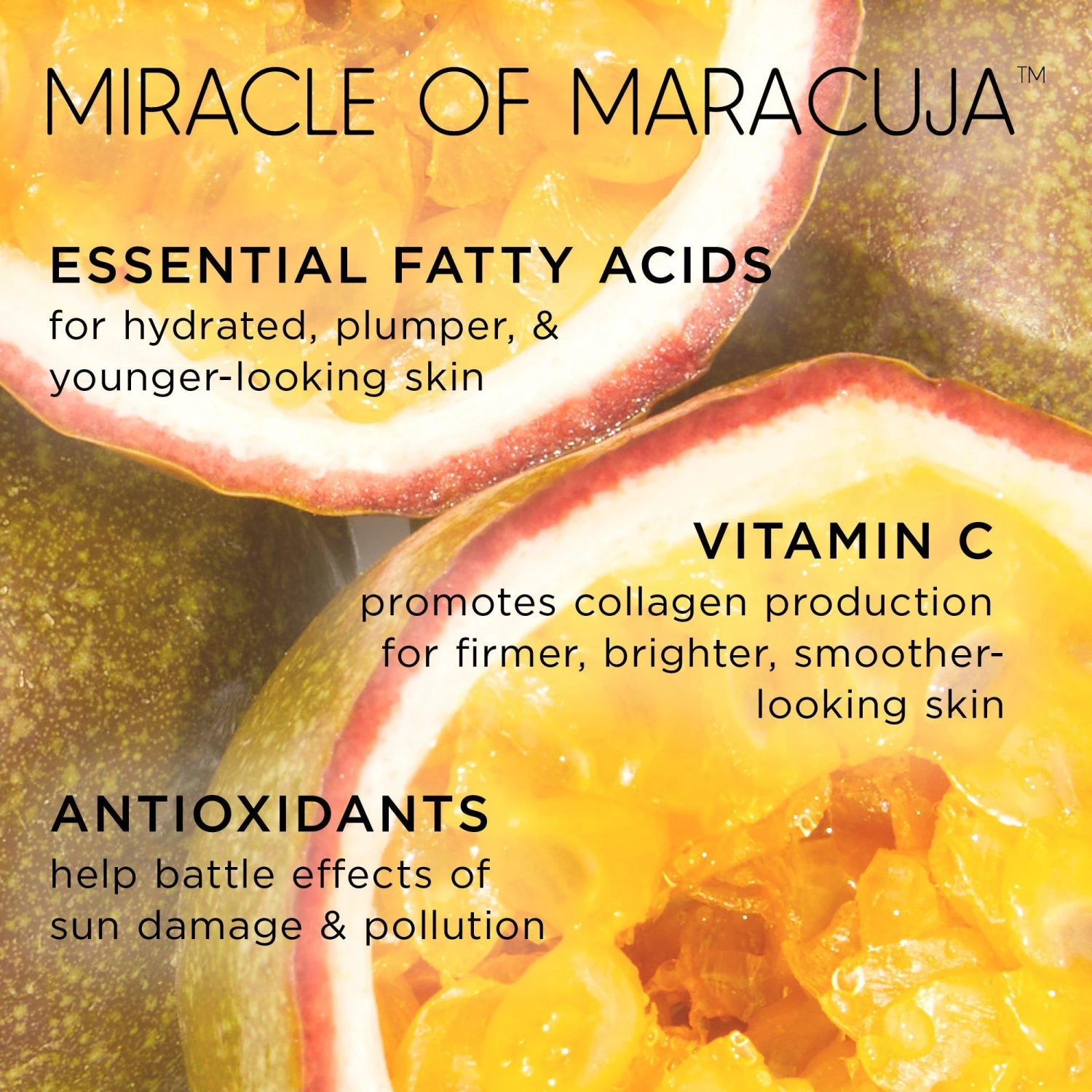 - Maracuja oil: rich in essential fatty acids & vitamin C for firmer, brighter, smoother-looking skin